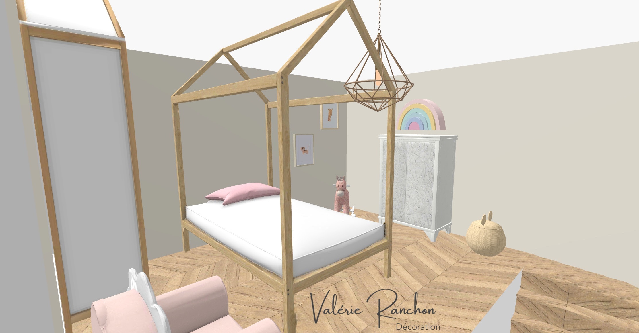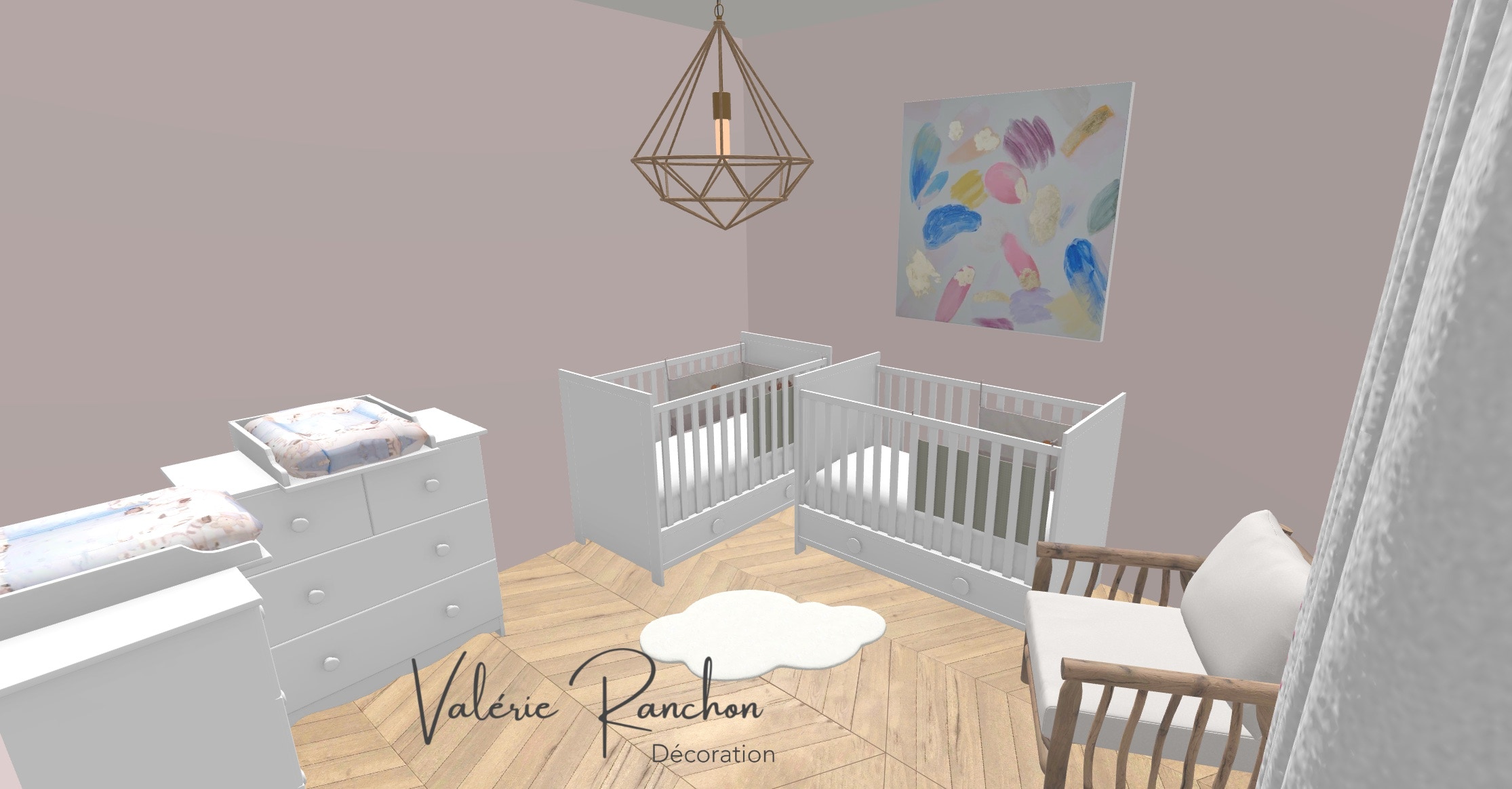 Sa chambre, a été rénovée pour accueillir non pas un mais deux berçeaux. La décoration murale et le parquet au sol ont été conservé afin de réduire les coût. Ainsi, les jumelles auront également leurs pièces pour elles.