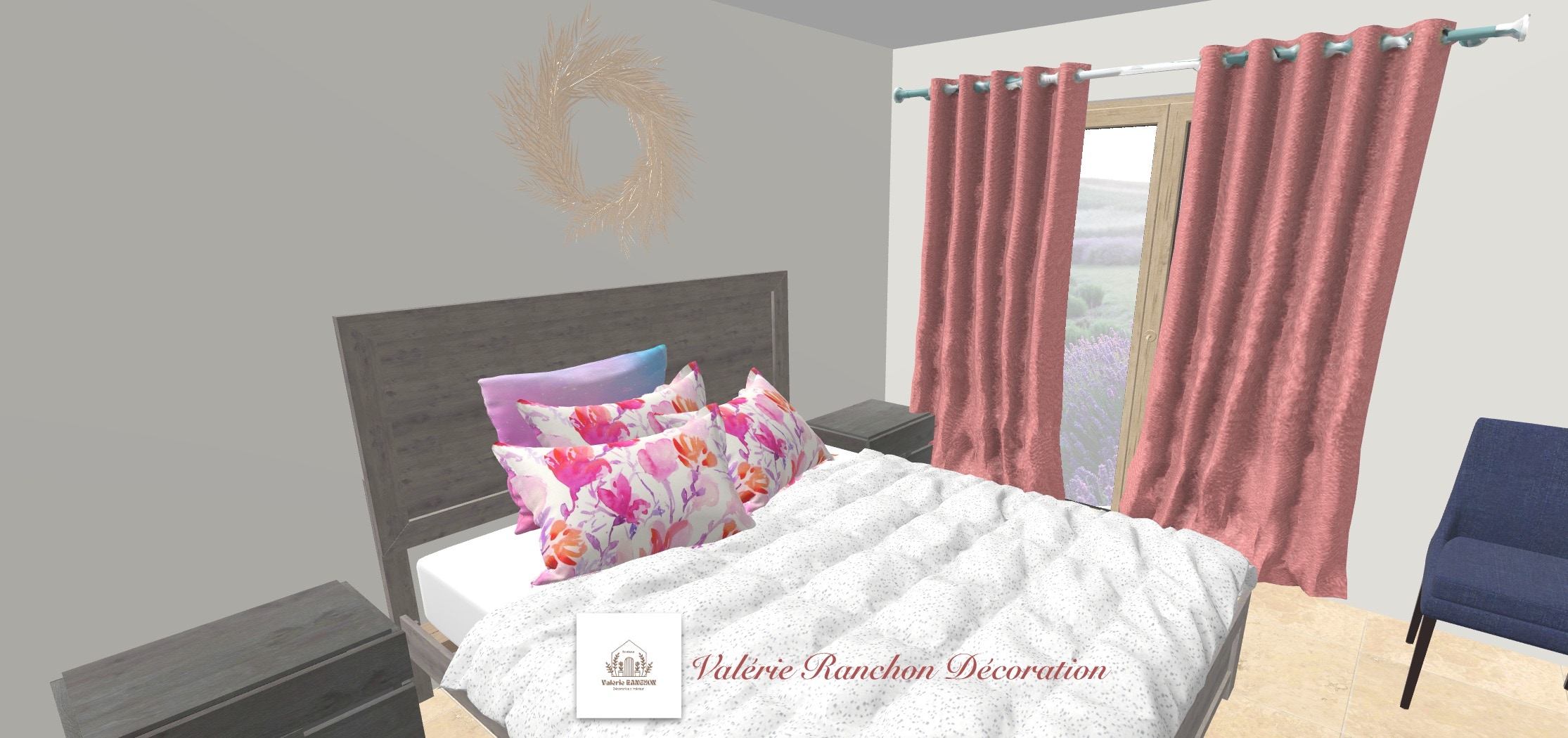 Une couleur bleue mer du sud sur un mur pour le côté dynamique, gris perle sur les autres, du bois pour le côté nature.