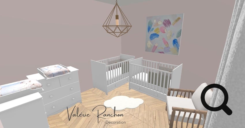 Sa chambre, a été rénovée pour accueillir non pas un mais deux berçeaux. La décoration murale et le parquet au sol ont été conservé afin de réduire les coût. Ainsi, les jumelles auront également leurs pièces pour elles.