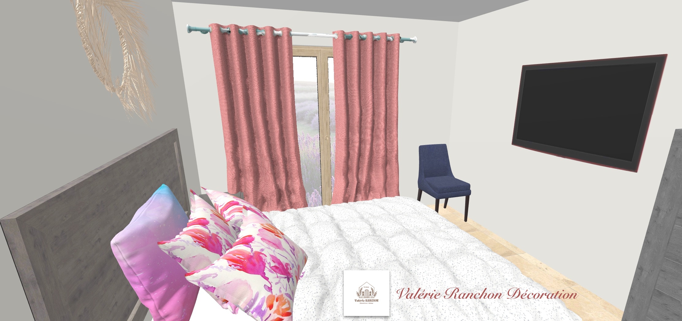 Une couleur bleue mer du sud sur un mur pour le côté dynamique, gris perle sur les autres, du bois pour le côté nature.
